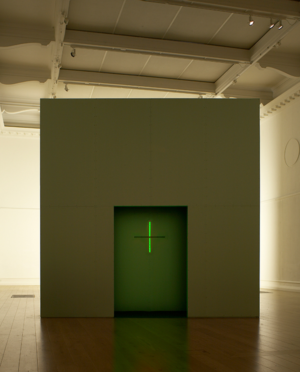 Installation with wood, aluminum, fluorescent lights, strobe lights and video projection